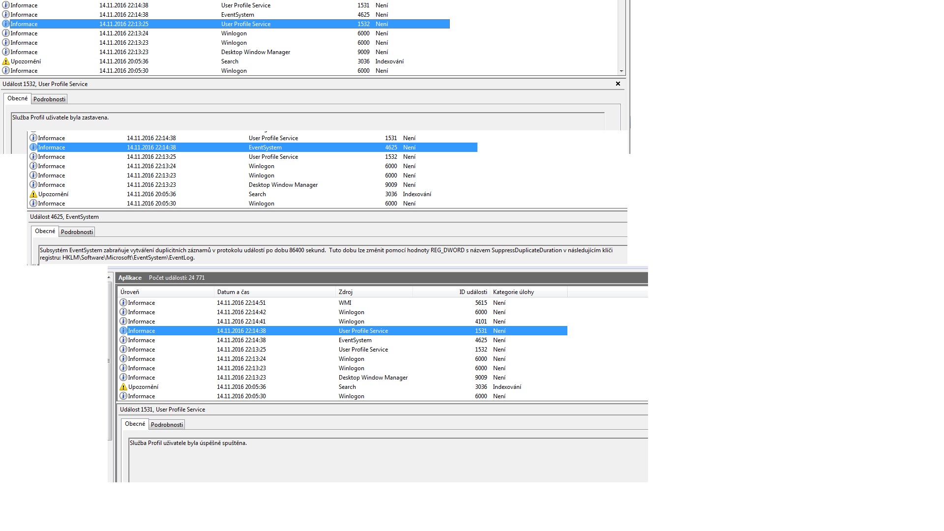 skoumám tedy prohlížeč událostí a tadyto se zobrazuje po spuštění od aktualizací (přet tím to tam nebylo