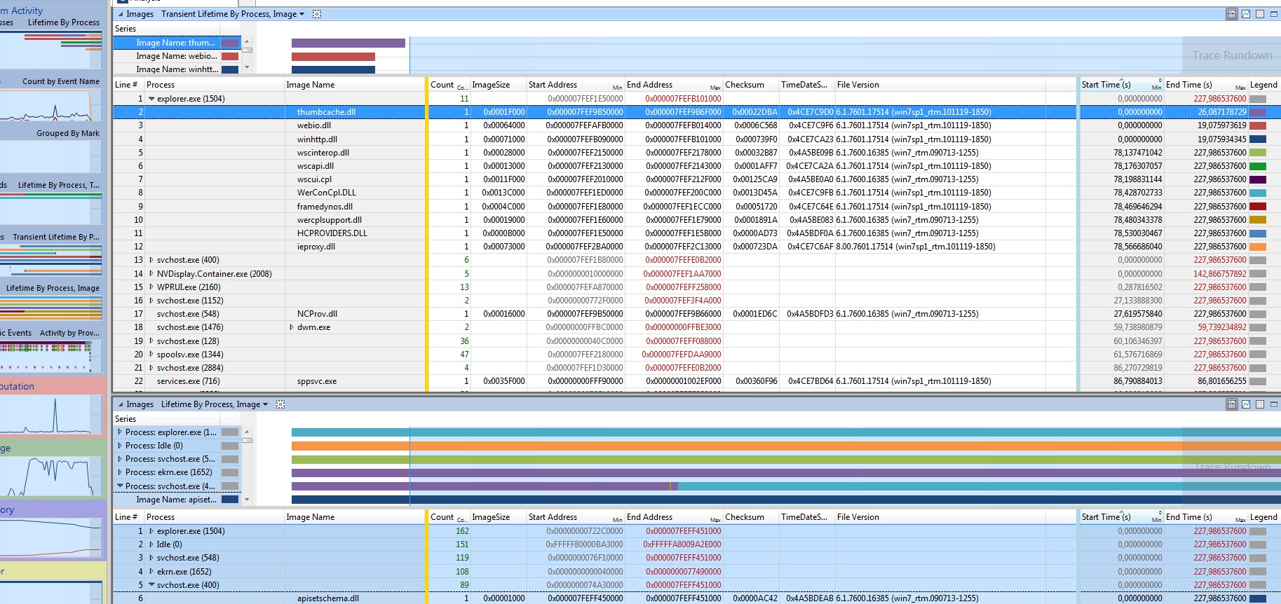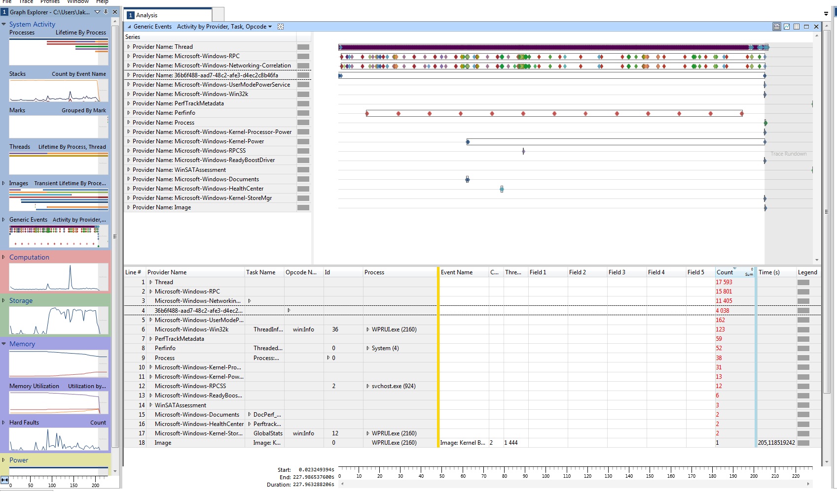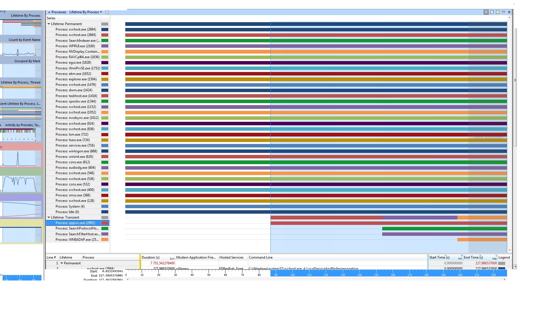 Windows Performance Toolkit má poměrně názorný graf "Process Lifetimes" (viz poslední graf na tomto obrázku), kde hned jasně vidíš, které procesy brzdí start systému. WinBootInfo takový graf asi nemá, musíš jít modul po modulu a porovnávat časy začátku spouštění, to je na pytel...
