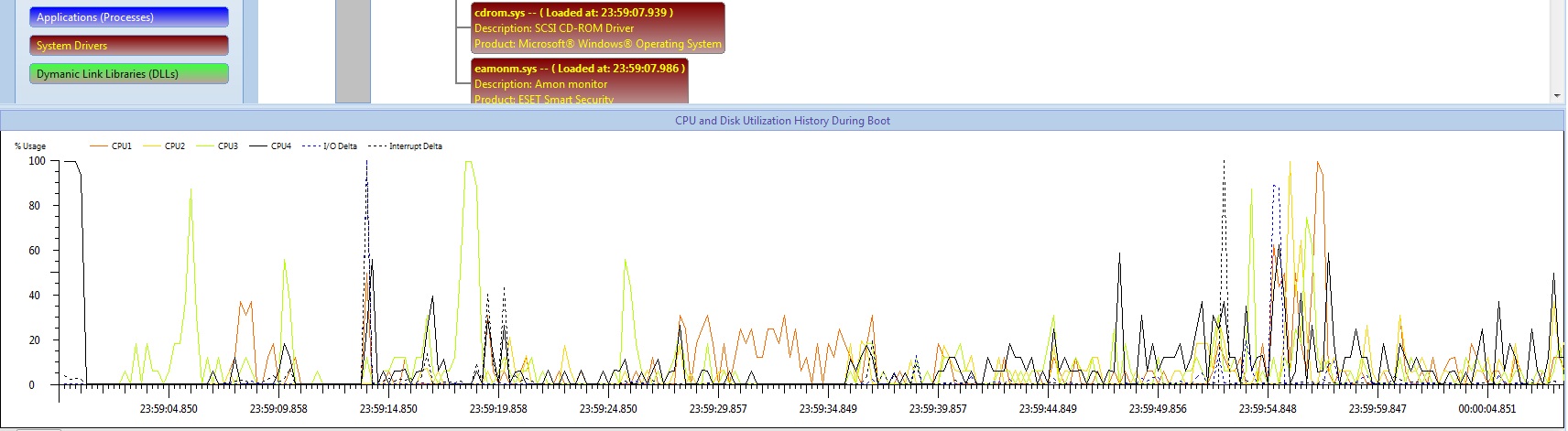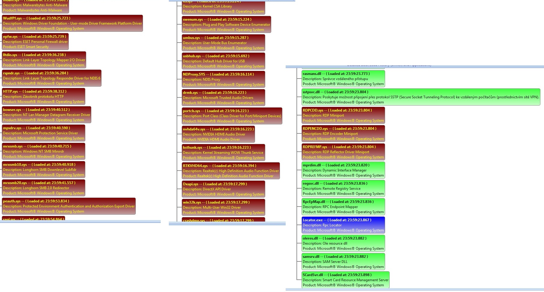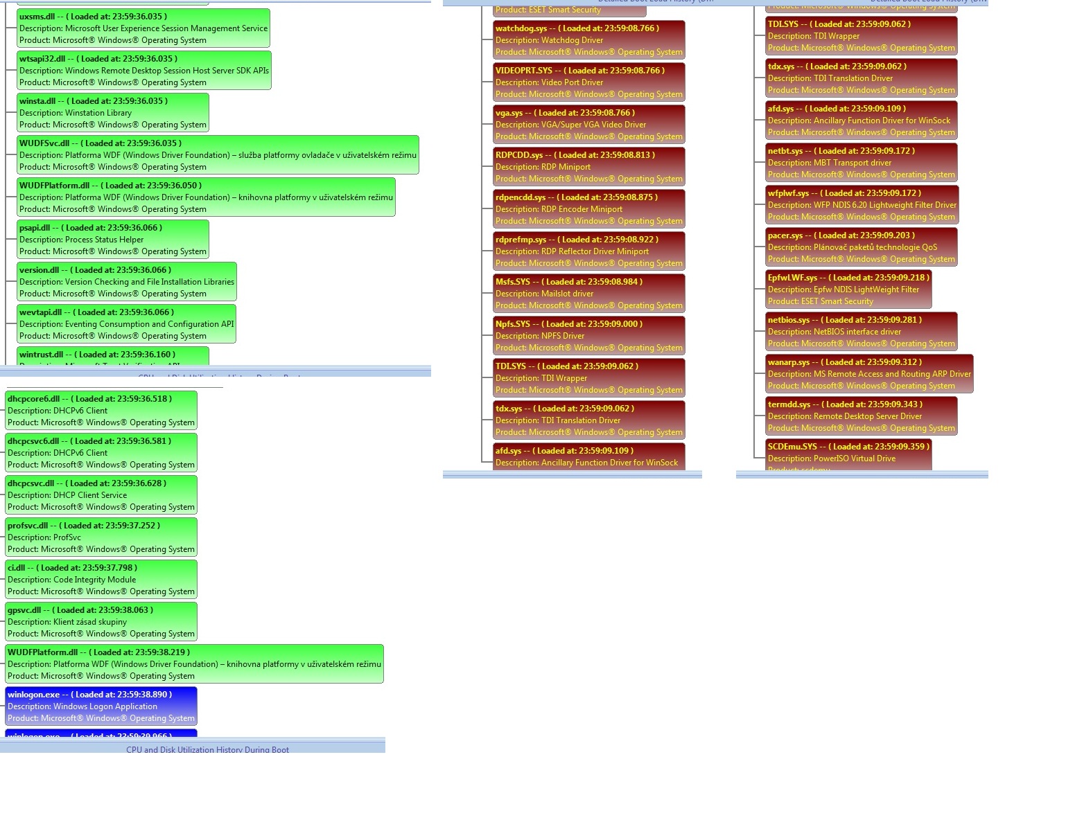 Ten druhý obrázek už jsi tu dával rozkouskovaný do tří, teď tam je zase něco jiného. Musíš jít proces po procesu a dívat se na startovní čas spuštění aktuálního a následujícícho modulu. Pokud bude mezi nimi méně než dejmetomu 2-3 sekundy, je to OK. Pokud budou tyto časy rozdílné o pár (desítek) sekund, máš pachatele (viz ten ESET Firewall, který se spouští 11 sekund).
