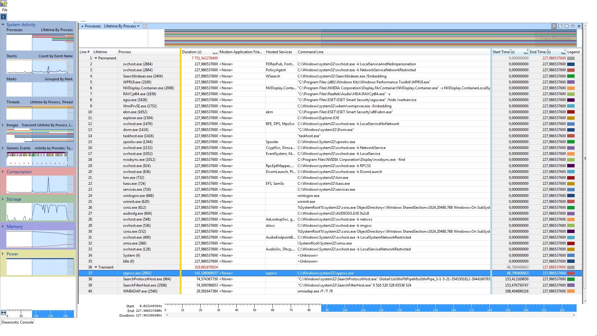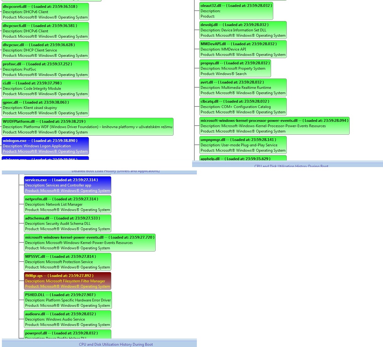 Graf CPU je naprosto k ničemu, Tebe nezajímá vytížení CPU po startu, ale délka startu jednotlivých procesů. Proces může třeba na něco čekat a během toho bude mít zátěř CPU nulovou.