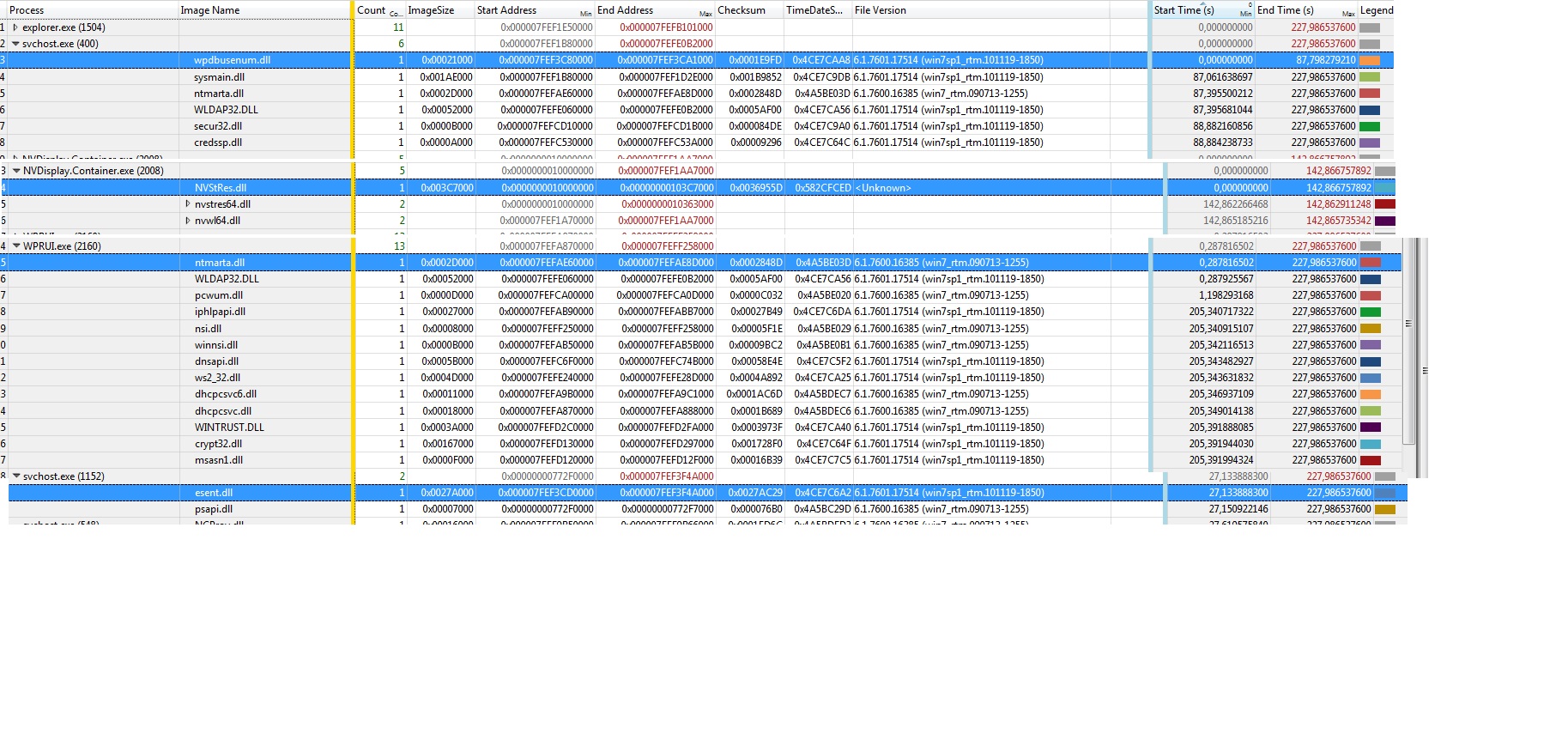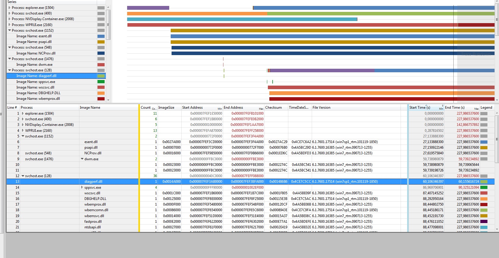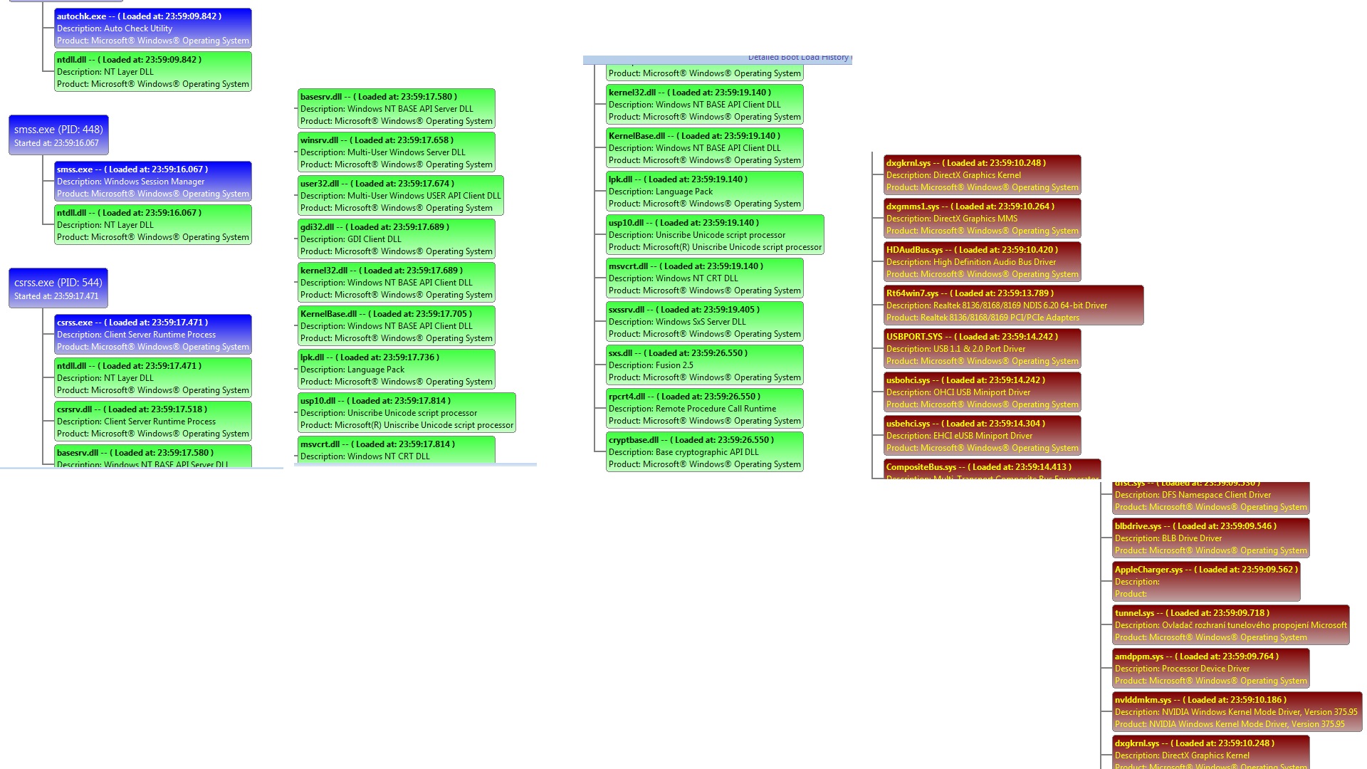 Sloupec v grafech je tak dlouhý, aby se do něho vešel popis, s délkou zavádění to fakt nesouvisí. Barva pak souvisí - jak jsem zjistil - s typem modulu (aplikace, DLL, system driver apod.).