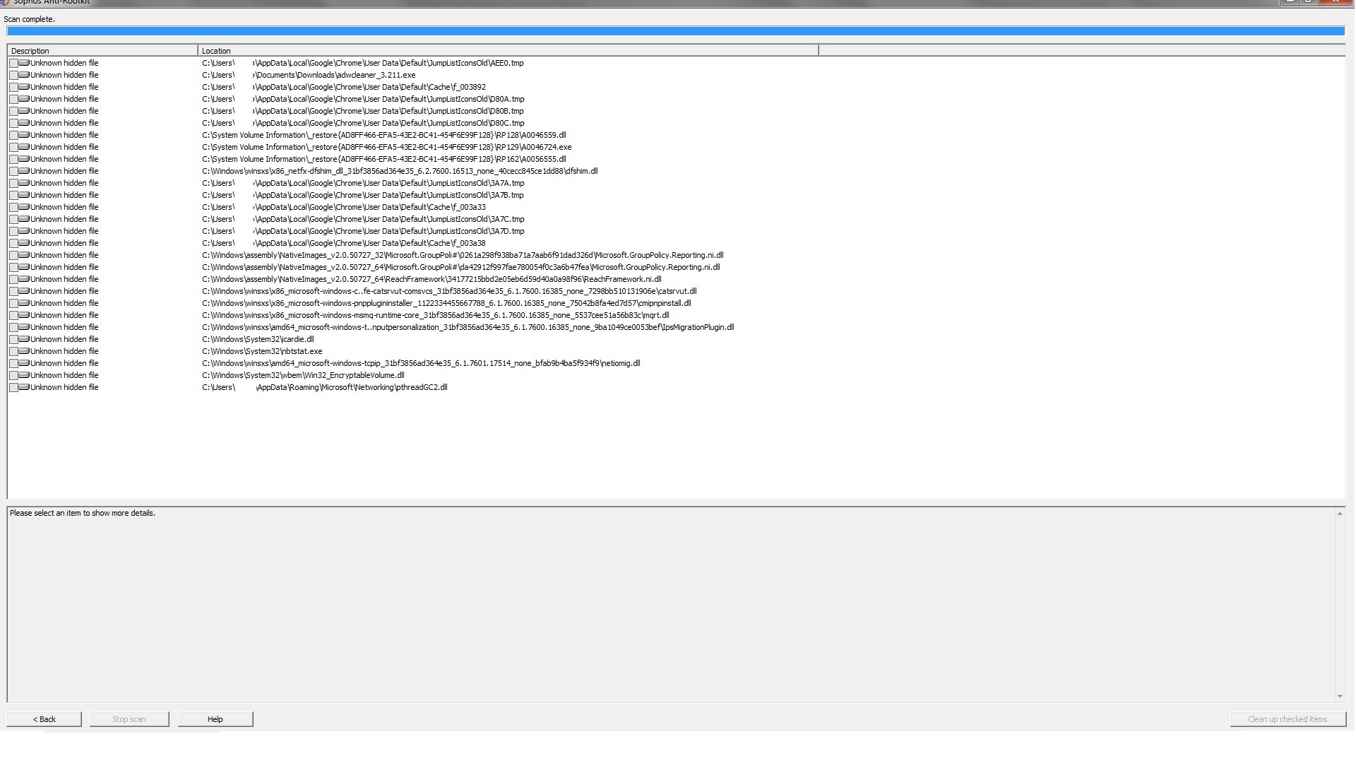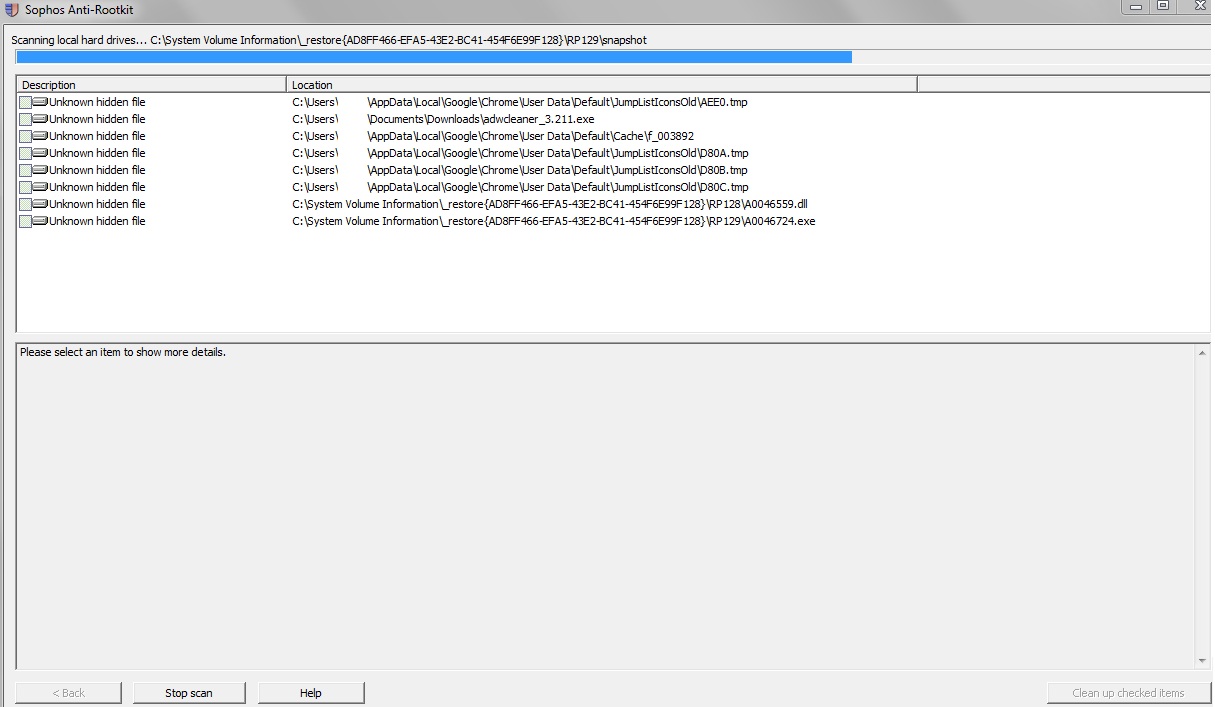 aha, ty řešíš antirootkit sophos, respektive výpis "neznámý skrytý soubor" - zamknutý může být z více důvodů, než že je to malware, viz neškodné tempy běžícího chrome.