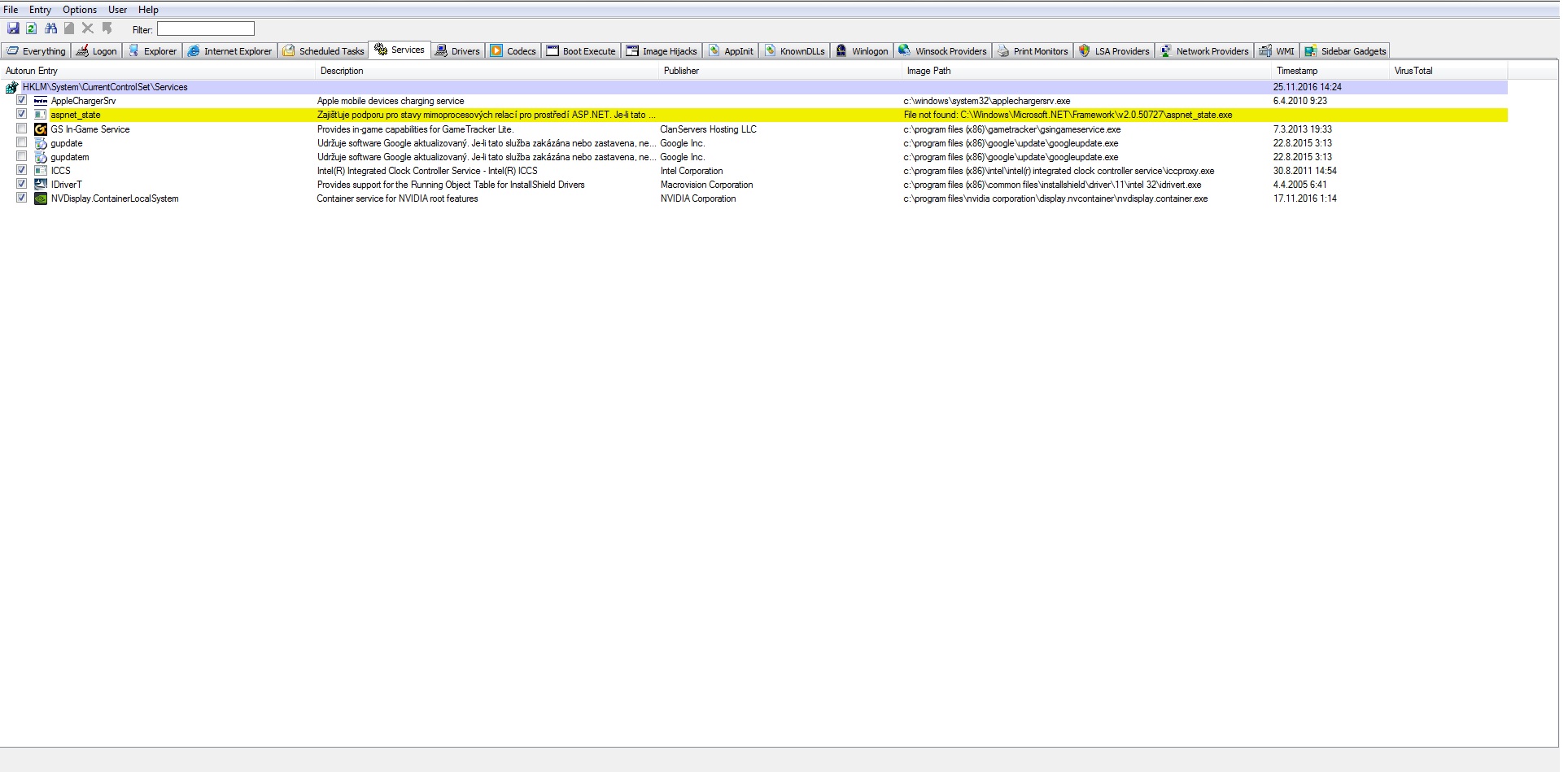 autoruns: záložka services, dobrý. (asi, nevím k čemu potřebuješ ten šmejd od macrovision, dělají do ochran)