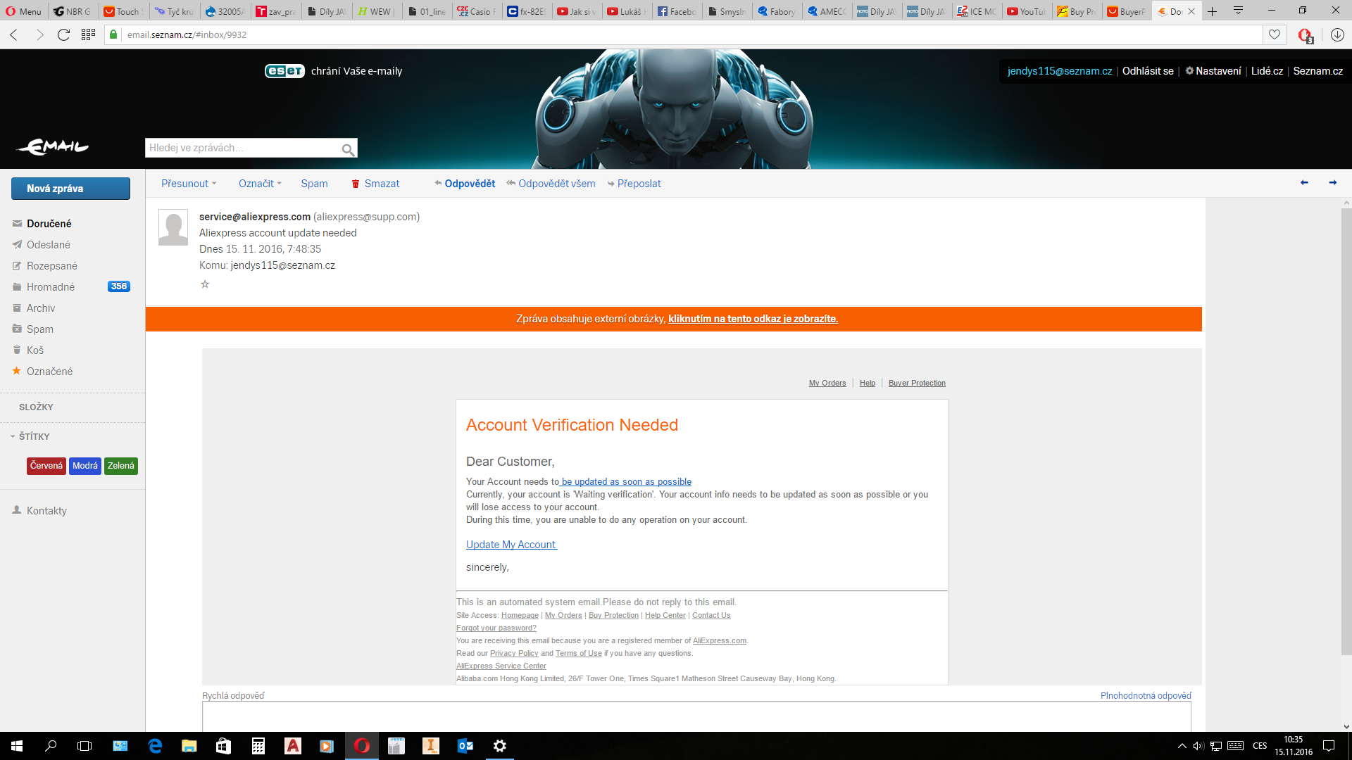 potřeboval by jsem poradit. Přišel mi tento email (viz přiložený soubor) a bohužel jsem tam vyplnil všechny udaje. Zatím jsem přišel o svůj účet na aliexpress.com a tpyuji, že asi budou chtít se dostat i k mému bankovnímu účtu. Proto bych se chtěl zeptat, jak bych měl v takovéto situaci postupovat ?