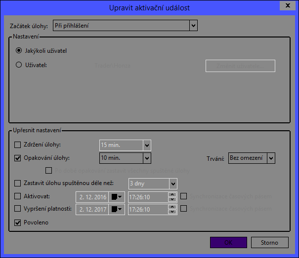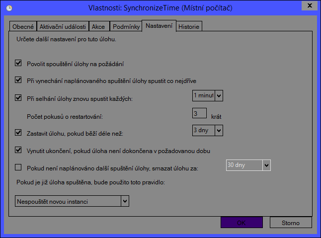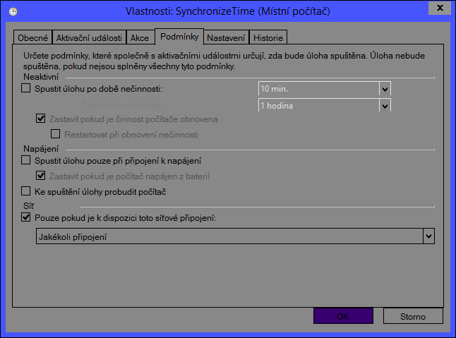 screenshoty nastavení této úlohy dávám do přílohy. Nastavení aktualizace na určitý čas mi tedy moc nepomůže, protože toto PC se spouští v různé časy. Problém je v tom, že úloha proběhne, ale čas se neaktualizuje, dokonce jsem v rámci hledání problému zkusil stejnou úlohu fungující v jiném PC s windows 8.1 vyexportovat a naimportoval do PC, kde tato úloha neplní svůj úkol a po spuštění této importované úlohy se nic nezměnilo, úloha proběhla, ale čas se neaktualizoval. Zkoušel jsem servery, o kterých vím, že na jiných PC fungují bezproblémově.