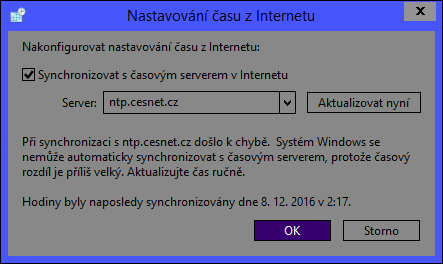 Když jsem zkusil synchronizovat čas, který jsem předem o několik hodin rozhodil, tak jsem si všiml této hlášky viz. další screenshot, která může být také na vině: