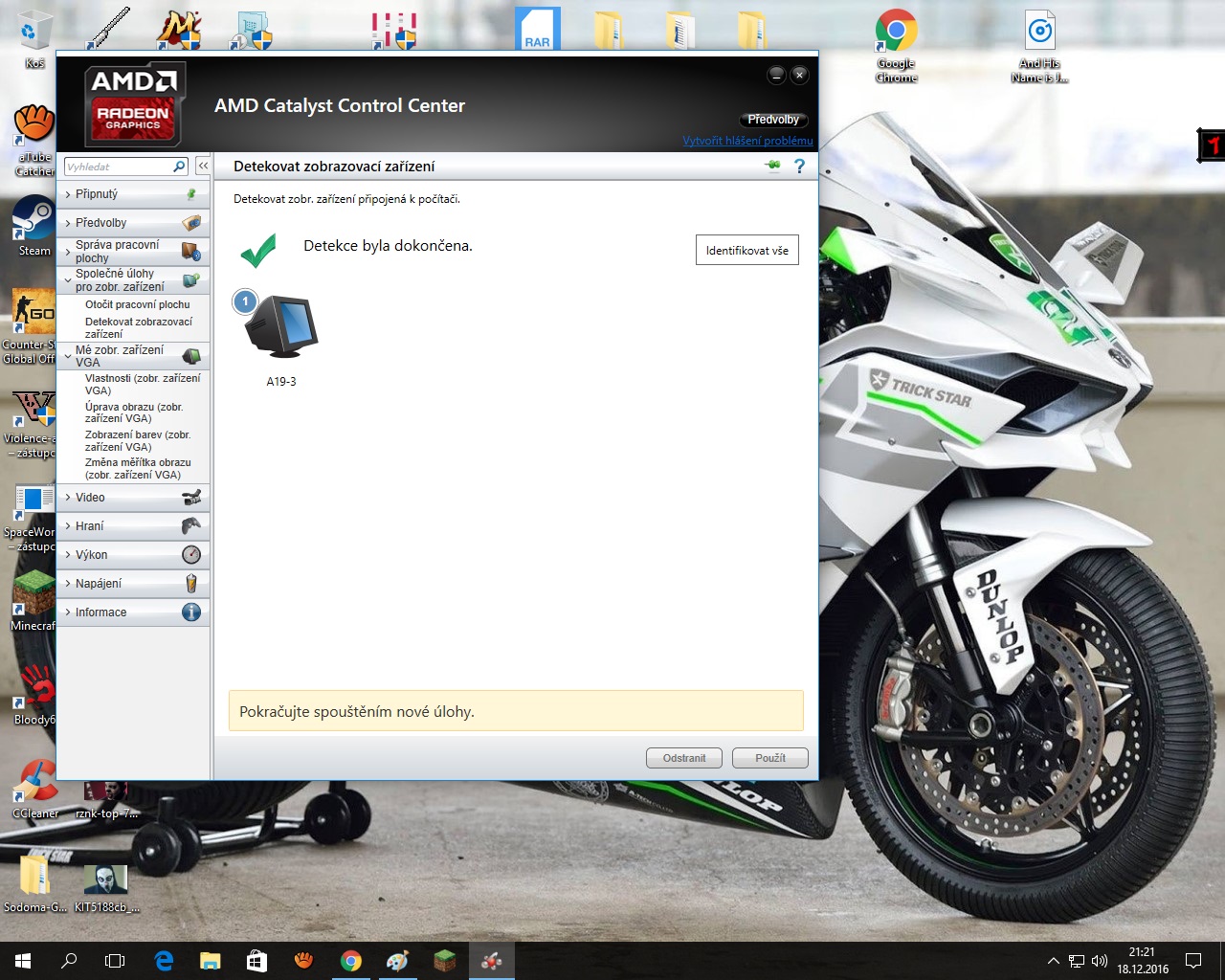 koukal jsem tady po fórech a nikde jsem nenašel odpověď na můj problém mám grafickou kartu AMD Ati Radeon HD 6670 která má 3 konektory HDMI VGA a DVI ve VGA mám zapojený jeden monitor a koupil jsem si redukci a zapojil jsem jí do DVI konektoru na graf.kartě a do tý redukce druhý monitor s VGA kabelem. No problém je v tom že PC se chová jakoby tam byl připojen pouze jeden monitor zkoušel jsem ten druhý detekovat přes AMD Catalyst Control Center (v obrázku) nebo i přes nastavení ve Win 10 (jo mám Win 10 :D )a nic prostě jako by tam zapojen byl jen jeden ale reálně jsou zapojené dva (v obrázku) koukal jsem i do BIOSu no tam jsem nic nenašel že by se tam měl "povolit" druhý monitor můžete někdo poradit předem díky :)