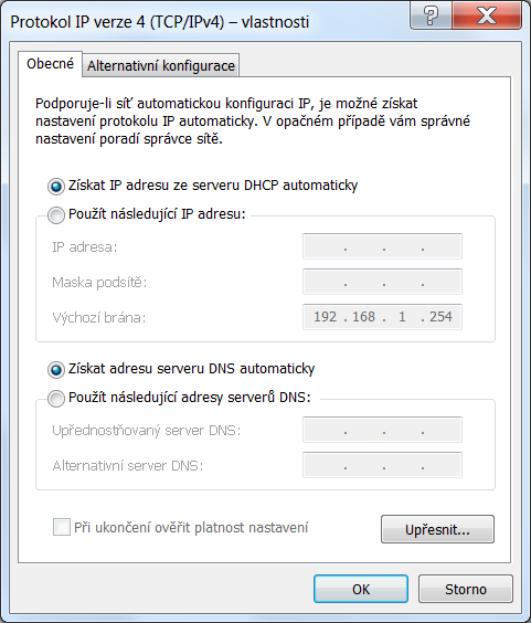 "Start" > "Ovládací panely" > "Síť a Internet" > "Centrum síťových připojení a sdílení" >dále otevřeme "Změnit nastavení adaptéru". Klikneme pravým tlačítkem myši na "Připojení k místní síti" a z kontextové nabídky vybereme "Vlastnosti". V záložce "Sítě" vyberte "Protokol IP verze 4 (TCP/IPv4)" a klikněte na "Vlastnosti"......