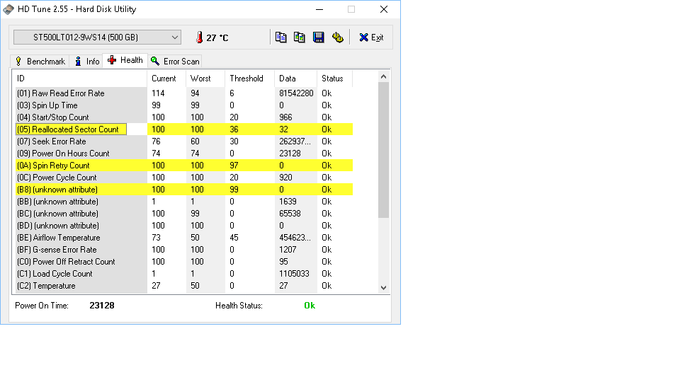 Zde je screen z hdtune a zdá se mi že ty žlutý hodnoty nejsou v pořádku.