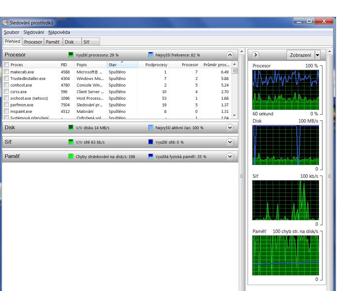 notebook pořád hrabe po disku (dioda svítí), kouknul jsem teda do Sledování prostředků a poslední řádek Paměť vykazuje pořád se měnící ale pořád velké číslo "Chyby stránkování na disk" mezi 50 a 198, pořád se mění. Taky o tom vypovídá okénko vpravo dole (čtvrté od shora) nazvané "Paměť 100chyb stránkování na disk".