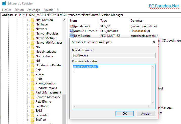Najit a 2X kliknout na : 'autocheck autochk *' (v mém pripade pod BootExecute) zmenit na 'autocheck autochk /k:x *'