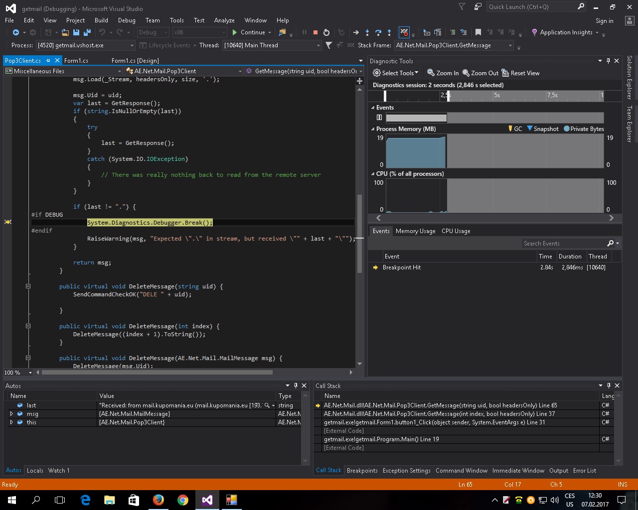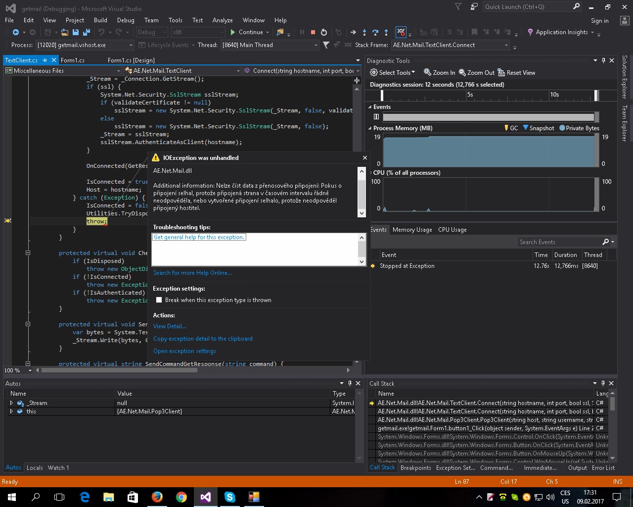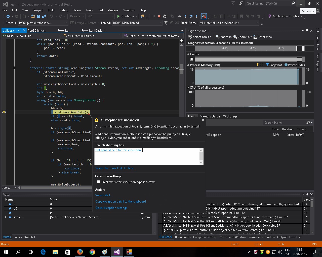 Vpravo dole mas historiu volani funkcii, tam vidis ze odkial sa to vlastne volalo (z fcie GetMessage a aj prislusne riadky) a nasledne uvazovat ze preco to tam padne. Teraz ti to zas padlo preto lebo pripojeni bylo vzdalene ukonceno, to tam pise.