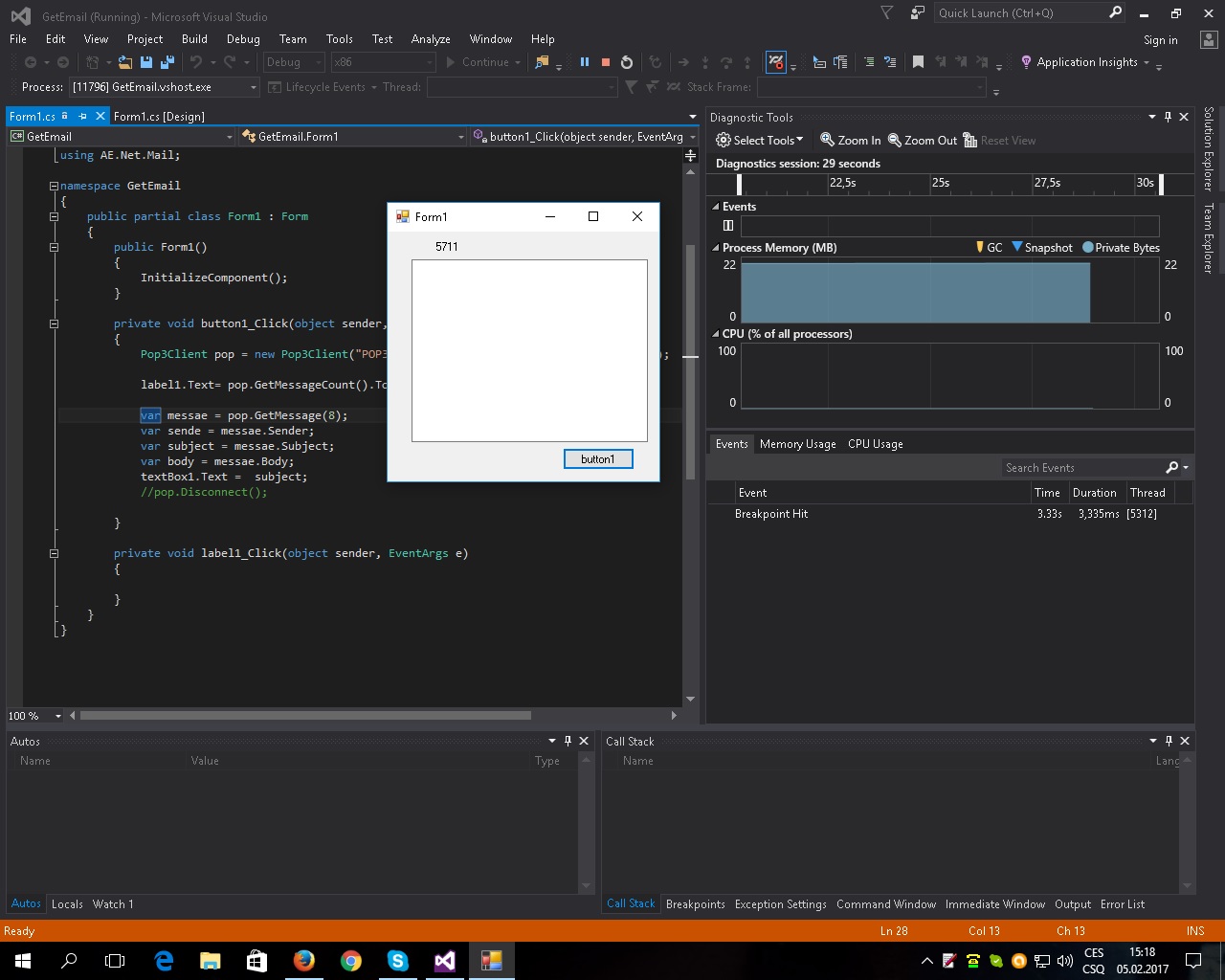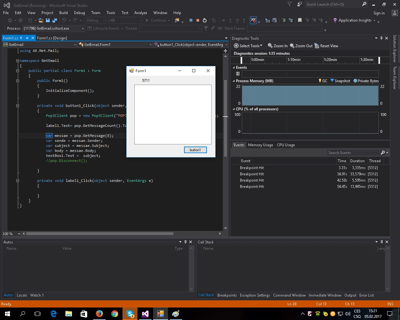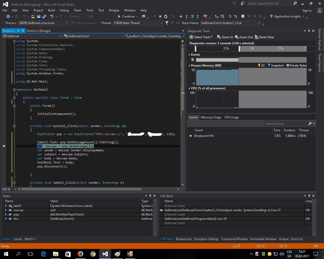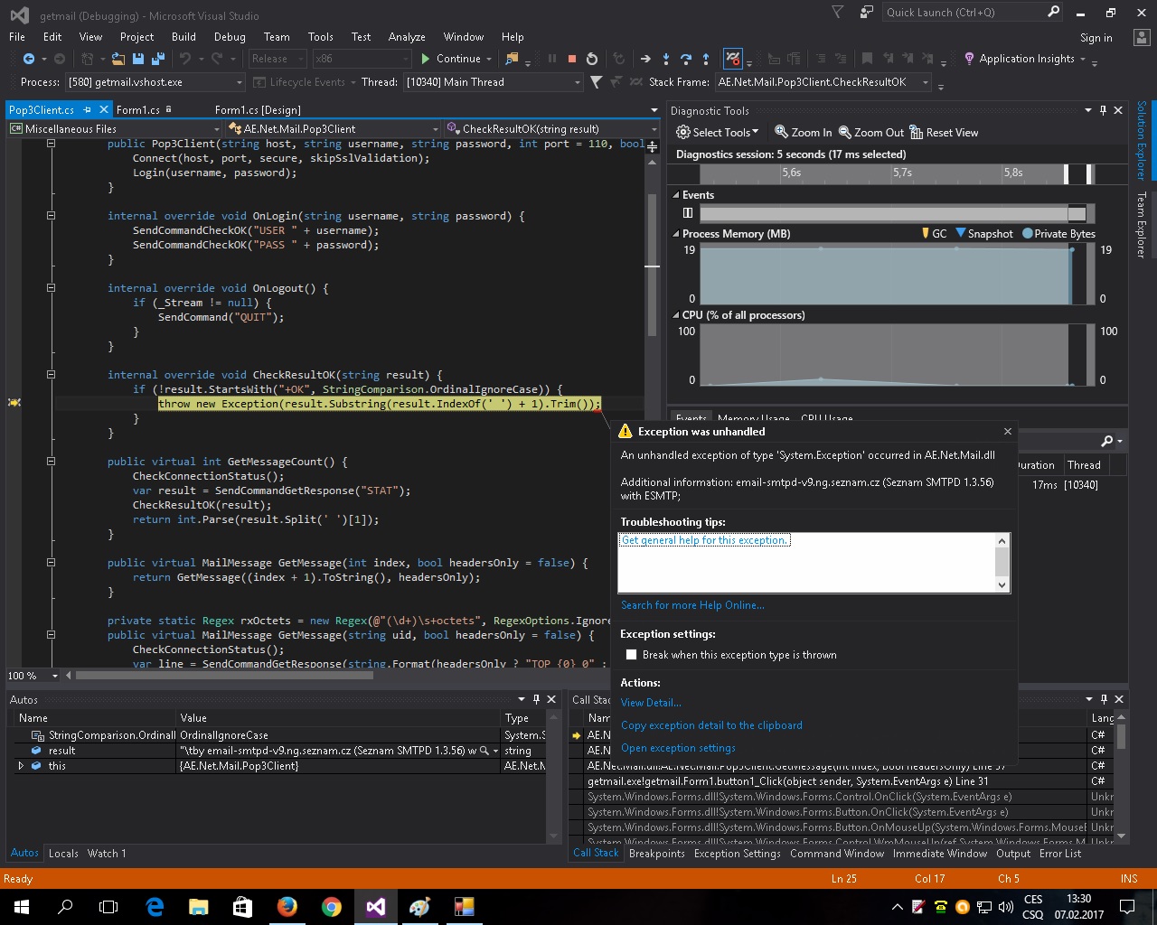 Vpravo dole mas historiu volani funkcii, tam vidis ze odkial sa to vlastne volalo (z fcie GetMessage a aj prislusne riadky) a nasledne uvazovat ze preco to tam padne. Teraz ti to zas padlo preto lebo pripojeni bylo vzdalene ukonceno, to tam pise.