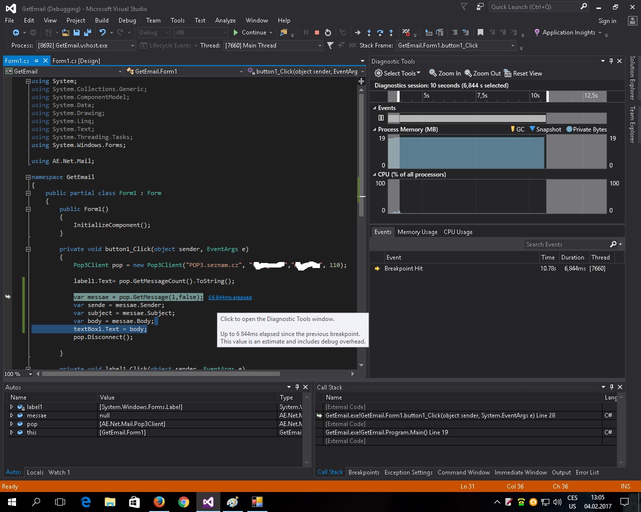 Já tam nemám žádný breakpoint když kliknu na Continue tak mě se ukáže toto kde může být chyba? já jsem zkoumal stránky aenetmail ale nemohu se v nich zorientovat