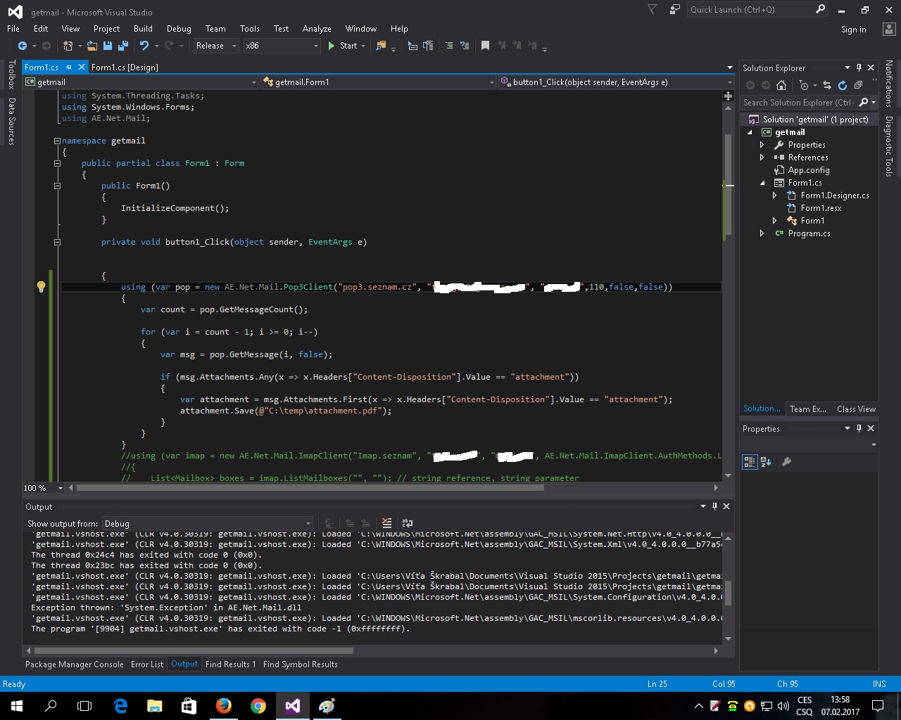 Já jsem dělal chybu v přihlašovacím údaji host na místo seznam.cz tak jsem dával pop3.seznam.czprotože jak jsem dělal v Deplhi7 emailového klienta tak to tam muselo být , v některých přílohách to je vidět, už mi nepadá okamžitě ale pokouší se o spojení po chvíli se to zastaví viz příloha tak jsem trochu k mé radosti postoupil ale teď potřebuji radu kde je chyba teď ? díky za shovívavost.