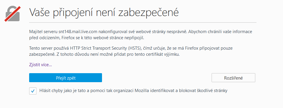 Při spojení s snt148.mail.live.com nastala chyba, protože je používán neplatný bezpečnostní certifikát. Certifikát je platný pouze pro následující domény: contacts.live.com, dub109.afx.ms, dub109.mail.live.com, dub110.afx.ms, dub110.mail.live.com, dub111.afx.ms, dub111.mail.live.com, dub112.afx.ms, dub112.mail.live.com, dub113.afx.ms, dub113.mail.live.com, dub114.afx.ms, dub114.mail.live.com, dub115.afx.ms, dub115.mail.live.com, dub116.afx.ms, dub116.mail.live.com, dub117.afx.ms, dub117.mail.live.com, dub118.afx.ms, dub118.mail.live.com, dub119.afx.ms, dub119.mail.live.com, dub120.afx.ms, dub120.mail.live.com, dub121.afx.ms, dub121.mail.live.com, dub122.afx.ms, dub122.mail.live.com, dub123.afx.ms, dub123.mail.live.com, dub124.afx.ms, dub124.mail.live.com, dub125.afx.ms, dub125.mail.live.com, dub126.afx.ms, dub126.mail.live.com, dub127.afx.ms, dub127.mail.live.com, dub128.afx.ms, dub128.mail.live.com, dub129.afx.ms, dub129.mail.live.com, dub130.afx.ms, dub130.mail.live.com, dub131.afx.ms, dub131.mail.live.com, dub132.afx.ms, dub132.mail.live.com, dub133.afx.ms, dub133.mail.live.com, dub134.afx.ms, dub134.mail.live.com, dub135.afx.ms, dub135.mail.live.com, dvt.mail.live.com, home.live.com, hotmail.co.jp, hotmail.co.uk, hotmail.com, hotmail.live.com, hotmail.msn.com, m.mail.live.com, mail.live.com, origin.dub109.mail.live.com, origin.dub110.mail.live.com, origin.dub111.mail.live.com, origin.dub112.mail.live.com, origin.dub113.mail.live.com, origin.dub114.mail.live.com, origin.dub115.mail.live.com, origin.dub116.mail.live.com, origin.dub117.mail.live.com, origin.dub118.mail.live.com, origin.dub119.mail.live.com, origin.dub120.mail.live.com, origin.dub121.mail.live.com, origin.dub122.mail.live.com, origin.dub123.mail.live.com, origin.dub124.mail.live.com, origin.dub125.mail.live.com, origin.dub126.mail.live.com, origin.dub127.mail.live.com, origin.dub128.mail.live.com, origin.dub129.mail.live.com, origin.dub130.mail.live.com, origin.dub131.mail.live.com, origin.dub132.mail.live.com, origin.dub133.mail.live.com, origin.dub134.mail.live.com, origin.dub135.mail.live.com, people.live.com, www.hotmail.com, www.hotmail.msn.com, www.live.com, www.mail.live.com Kód chyby: SSL_ERROR_BAD_CERT_DOMAIN
