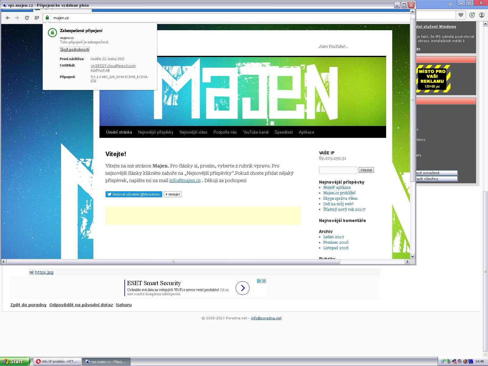 Ahoj, dneska jsem vyhrabal starý pc, kde jsou nainstalované W XP. Na nich nešlo jak v IE, tak v Chrome a Opeře https. Po reinstallu nic. Na stránky jen s https se nedostanu, youtube jede na HTTP. Jinak na W vista i 7 to jde. Na YT mi Opera píše xhybu, ze pouziva stare zabezpeceni. TSL 1.2. Jak to opravit? Dkj