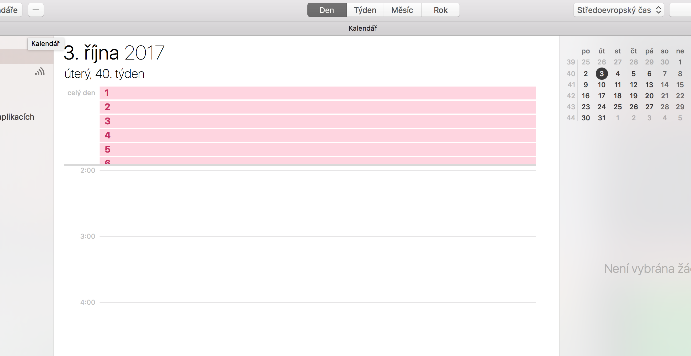 Dobry den, trapi me zobrazeni kalendare na MacOS, zapnu kalendar a pri zobrazeni udalosti pro vybrany den mam casovou osu podle nastaveni a nahore je seznam ukonu pro dany den bez casoveho upresneni, tudiz v lince CELY DEN, nicmene, pokud si do kalendare ulozim vicero veci na cely den, tak vidim nahore najednou jen asi 5 a musim scrollovat dolu, abych videl dalsi, lze nejak udelat, abych videl ty schuzky vsechny a klidne posunul nebo zmensil, ci dokonce odstranil casovou osu danych dnu, protoze je pro me mnohem dulezitejsi videt vsechny celodenni ukony.