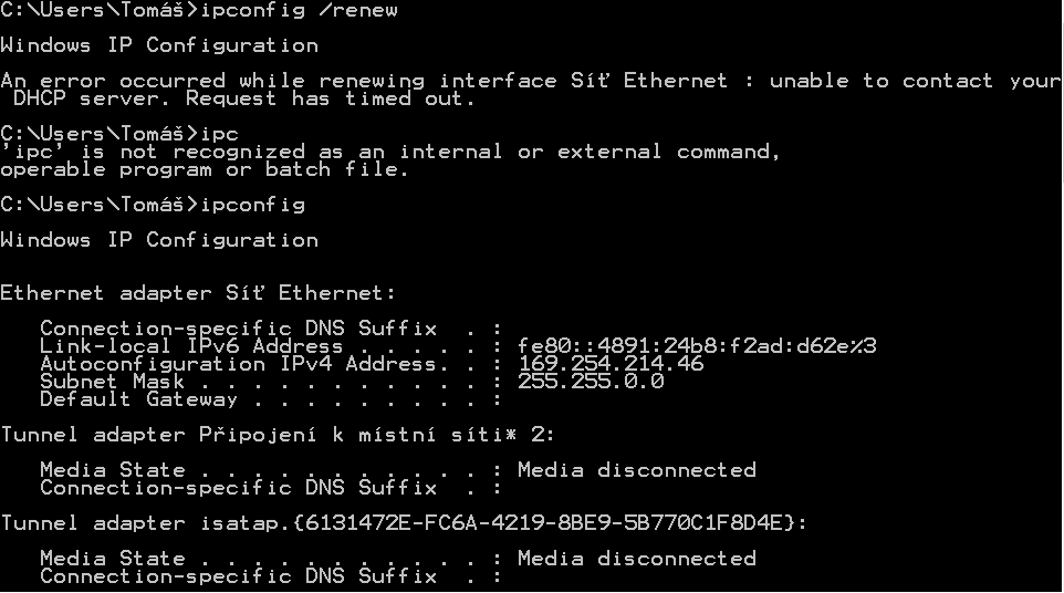 Podla vypisu ipconfig z dotazu je tvoj problem ten ze si si nenastavil rucne IP. To je ale nutne leb…