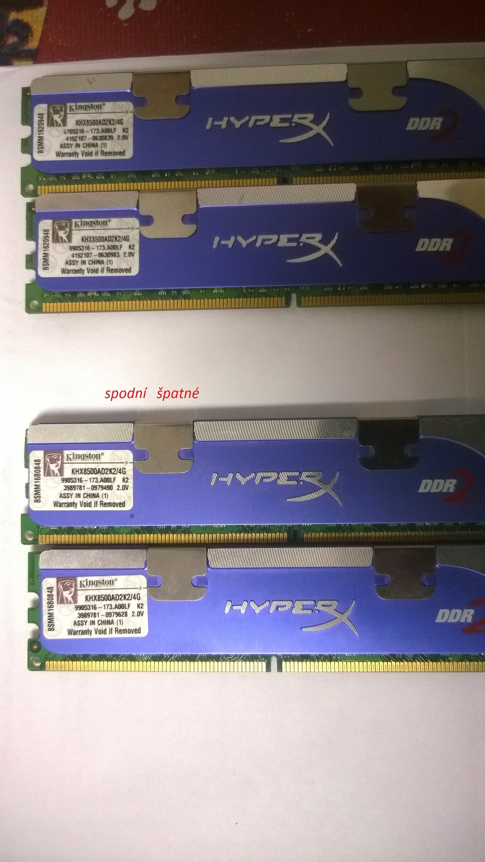 Zdravím koupil jsem si od jednoho pána 2x2gb ram ale ukazují mi v pc jen 2gb.Zkoušel jsem různě proházovat ovšem pořád ukazují 2gb dohromady.Mám ještě jednu sadu 2x2gb a ty ukazují správně,dokonce jsem zkoušel dávat po jedné ale jedna ram ukazuje místo 2gb jen 1gb nevíte jestli je to vůbec možné moje deska GA-EP35-DS4.Ram pamět viz.foto lze zvětšít