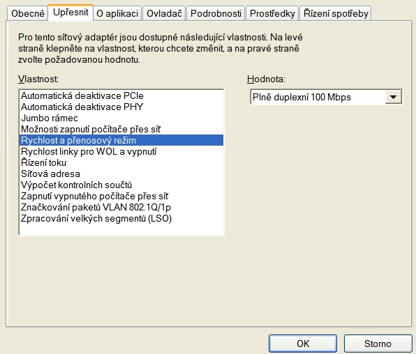 išiel som presne tam ako vy zmenil som hodnotu na tú 100 mb,čo je vpravo resetlo to pripojenie a už…