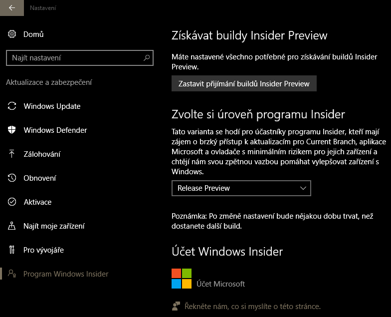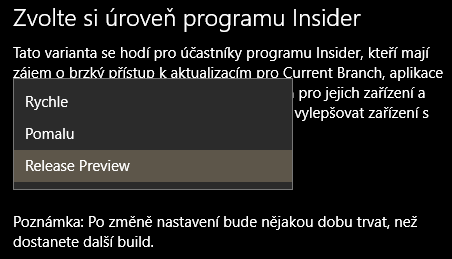 Musel by sis nastavit "Rychle", aby se k tobě dostaly nejnovější buildy. Pokud tam necháš Release Preview, dostaneš to až v okamžiku, kdy to bude těsně před vydáním.