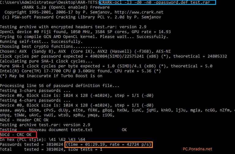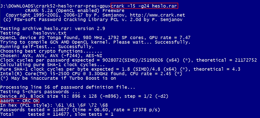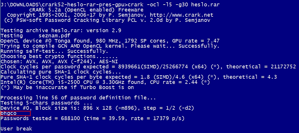 Teď jsem zkoušel soubor PDF (2,9 MB) s heslem 24 znaků (malé, velké a čísla), heslo vypadlo za 39,59 vteřiny. Tady je krása v tom, že ono to necrackuje to původní heslo o 24 znacích, ale vytvořilo to nové heslo o pěti znacích, kterým ten RAR jde otevřít.
