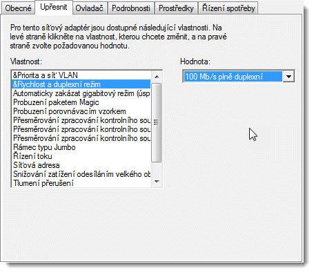 Upřesnit/Rychlost a duplexní režim. Druhá záložka zleva. [http://pc.poradna.net/file/view/28550-tad…