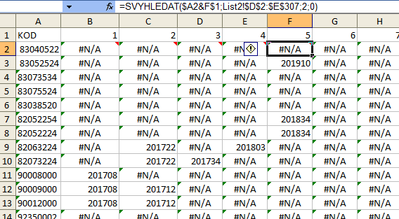 =SVYHLEDAT($A2&1;List2!$D$2:$E$307;2;0) - vyhledání pro leden, =SVYHLEDAT($A2&2;List2!$D$2:$E$307;2;0) únor atd.