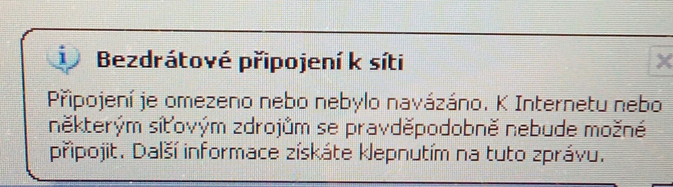Taky si myslim, ze systemem to nebude, kdyz me to na tom starym jelo. Ta bublina vyskoci kdyz se to pripojuje u te ikonky s pocitacem se ukaze zluty trojuhelnik, ze je omezena sit a ze mozna bude omezeny pristup k siti a internetu nebo tak neco, omlouvam se, mozna tam ani slovo internet neni, ted jsem to dele nemel pred sebou a mozna se me to plete s win7.