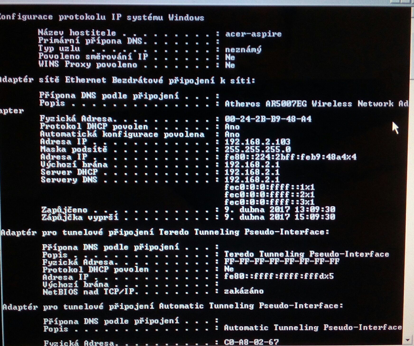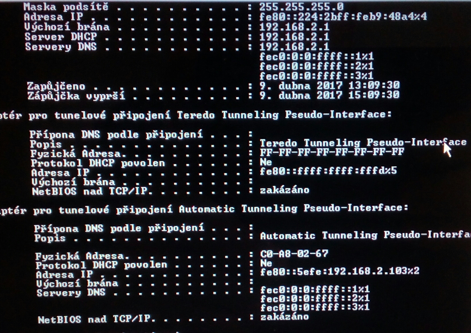 Nene nemam, v routeru je WAN dynamicky, LAN v routeru zacina 192.168.2.100 (zkusil jsem predelat z 192.168.1.100), IP adresy nekoliduji. Telefony se bez problemu pripoji, pocitac ma ziskavani IP a DNS pomoci DHCP, IP adresu a DNS dostane spravnou. Ale napise dole u hodin v bubline, ze pravdepodopobne nebude fungovat sit a internet (nedostanu se routeru 192.168.2.1), staci kdyz jenom pres telefon v rozhrani routeru zmenim WIFI security na otevrenou sit, a ihned po ulozeni se s pocitacem znovu pripojim a internet jede a jiz se dostanu do rozhrani routeru i pres pc. Takze tipuju neco se zabezpecenim, je to Win XP SP3 takze by mel podporovat WPA2/PSK AES coz se v pocitaci take tak ulozi. Na starem routeru to tak fungovalo jen jsem router vymenil a slus. No nechapu to, SSID jsem pojmenoval jinak o jeden znak, historii bezdratovych siti jsem v adapteru smazal. Divne to je.