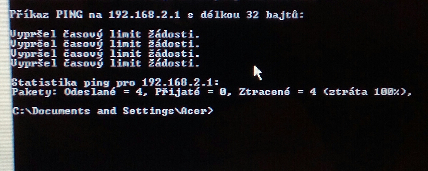 Ping na vsechny adresy neuspesny, vyprsel casovy limit zadosti, stacilo pingovat jen 192.168.2.1 a bylo jasno, zkusil jsem i ping na pripojeny telefon v siti, take nic.