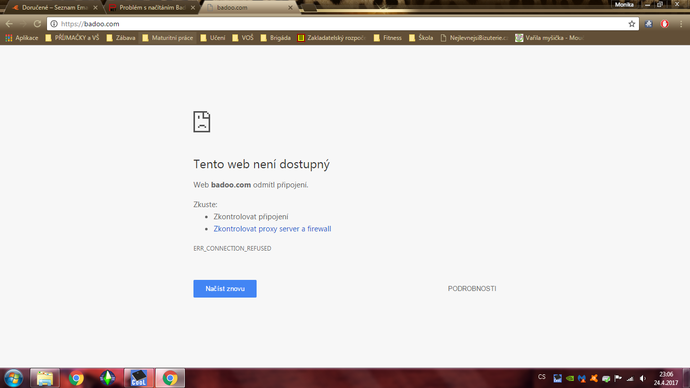 Ahoj všem, obracím se na vás s prosbou ohledně načítání webové stránky Badoo. Problém je takový, že ať je to přes jakýkoliv prohlížeč, vždy to ukáže chybu a stránka se nenačte. Neví prosím někdo, co s tím? za každou radu budu vděčná a předem děkuji za vaše odpovědi. :-)
