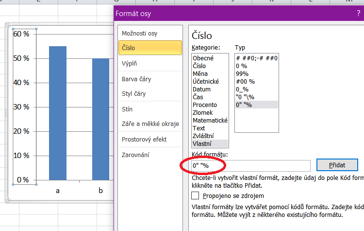 chtěl bych se prosím zeptat, zda se v Excelu, při tvorbě grafu, dá docílit toho, abych měl na ose grafu oddělená čísla od procent mezerou. Jaký bude kód formátu? Když totiž definuju ve formátu osy číslo jako "Procento", tak mi Excel automaticky vynasobí číslo stem a přiřadí znak procenta hned za číslo, což je typologicky špatně (viz obrázek: 2zzkxf7.jpg).