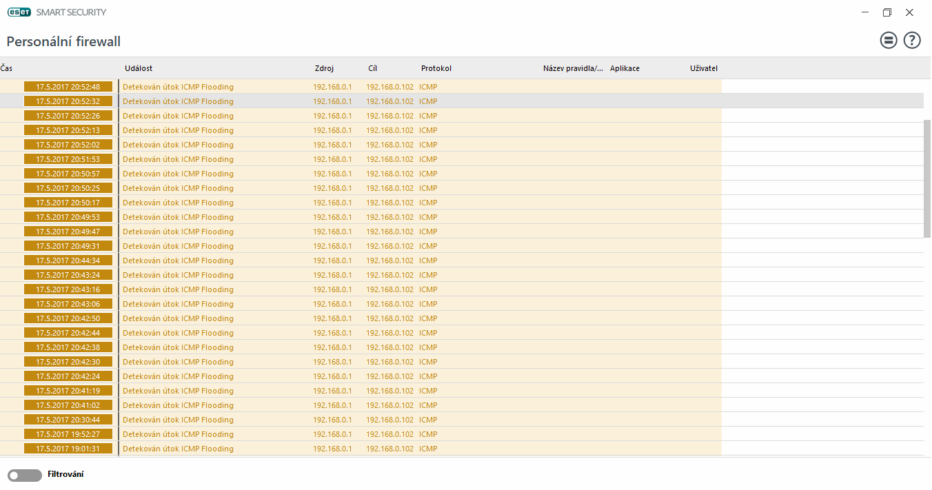 obracím se na vás s radou ohledně problému, nejspíše zavirovaného počítače nebo jinak mě nic nenapadá. ESET mi 11.5. vyhodil první hlášku "Detekován útok ICMP flooding" a že se mu jej podařilo zablokovat. Tak jsem to ignoroval. Další stejná hláška vyskočila 15.5. s tím že jich za ten den bylo zhruba 5. Další vyskočila o den později, to už jich ale bylo 2x tolik. No a dnes už jich je víc jak 30 s tím, že teď kolem půl 9 se to nějak rozjelo. Začal se mi při tom odpojovat ntb od routeru. Ostatní zařízení v síti šlapou jak hodinky. Z přiloženého logu lze vidět, že zdroj útoku je IP adresa routeru a cíl je IP adresa mého NTB. Prosím vás tedy o radu co s tím, děkuji.