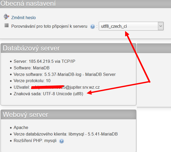 Také mi to přijde, že je PHPMyAdmin nějak divně nastaven. Ale vůbec netuším, kde co nastavovat. Ještě schválně zkusím přehodit kódování "porovnání pro toto spojení".