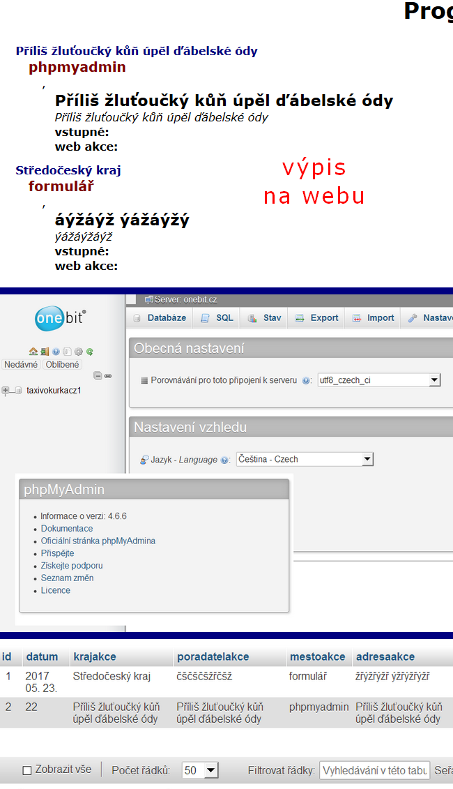 Děkuji ti za navedení. Stále mi vrtalo hlavou to latin2, které se mi po tvém příkazu vypsalo. Prozkoumal jsem bedlivě PHPMyadmina na Webuzdarma a našel tam porovnání na latin2. Tak jsem to přehodil a už to mám dobře i tam.