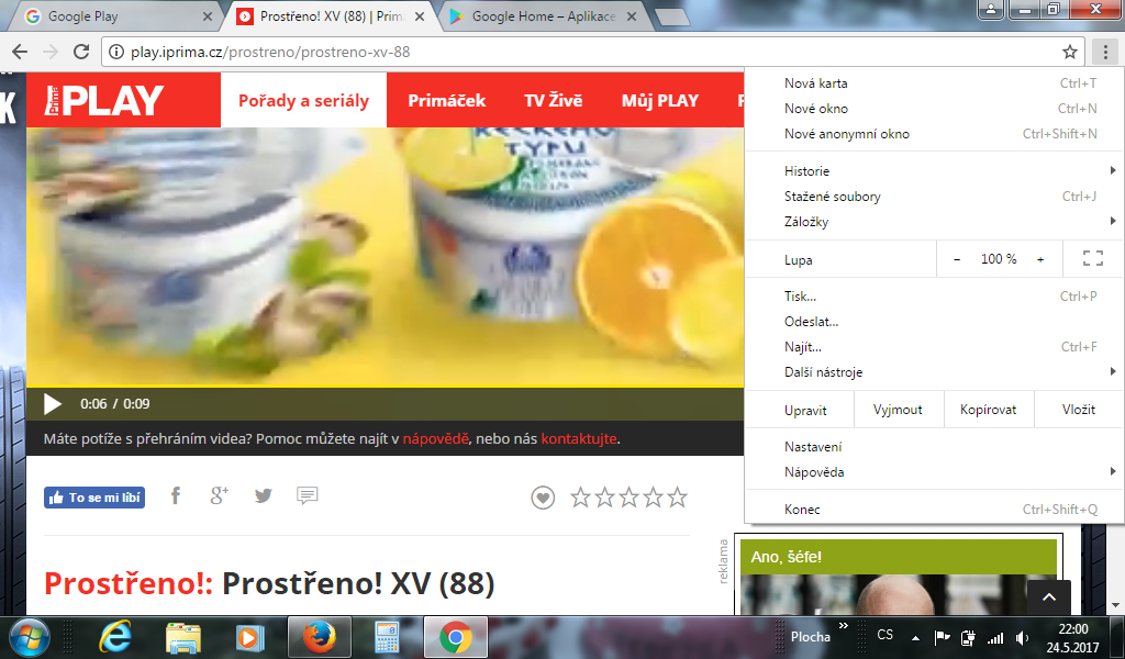 Jinak to teda zrcadlím. Pochopila jsem, že právě tak Chrom. funguje. Z YouTube to taky můžu nejdřív pustit na mobilu a pak to poslat na TV, ale třeba z Primy, když chci něco pustit, najela bych na jejich stránky, pořad..., tak tam žádné odeslání přeci není.