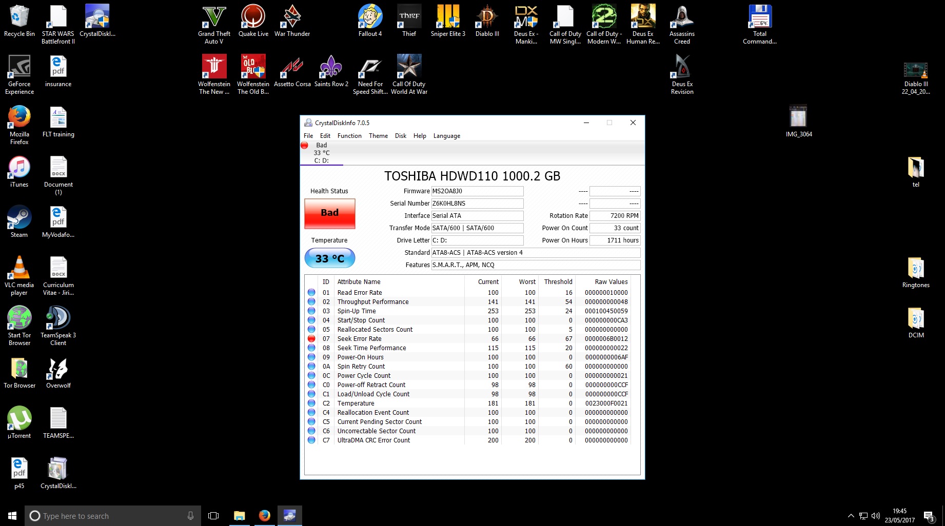 1. Nainstaloval program Malwarebytes, scan nalezl problem v cracku hry Thief 4. Problem odstranen. (nejsem si jisty ale mam dojm ze pri minulych problemech s HDD sem ho hral taky ale nemuzu mu to jenoznacne prisoudit)