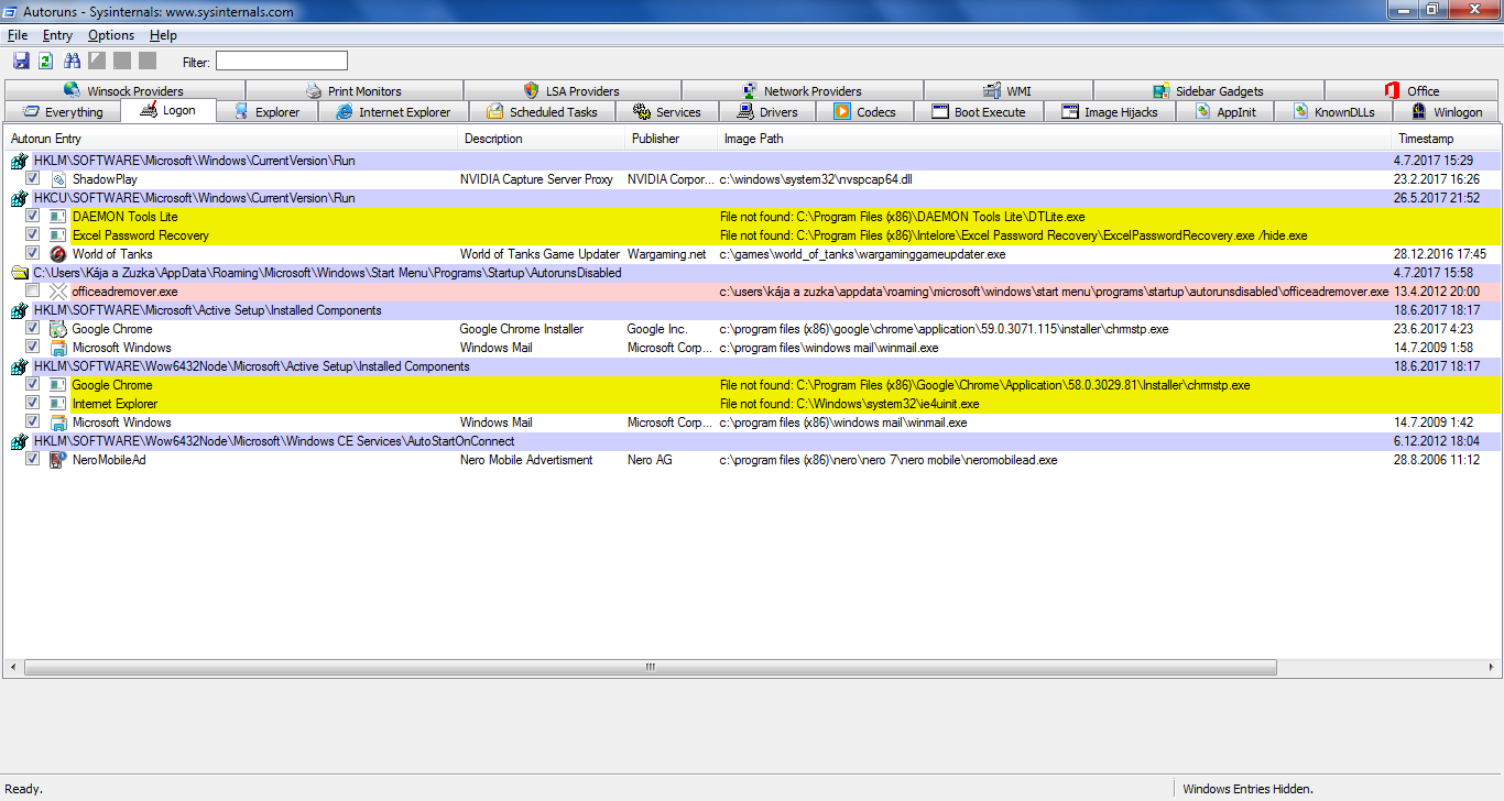 žlutě označené nenalezené položky jsou nejspíš odinstalované, tak je zruš.