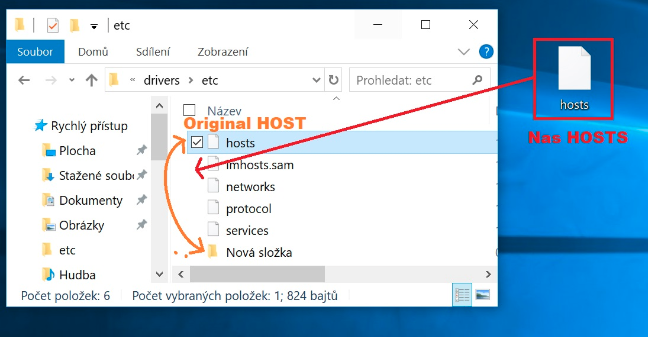 3) Vytvořte si (ve složce "../etc") novou složku, pojmenujte jí třeba 'záloha' (kdy by jste chtěl udělat krok zpět a podobně ) kde si schováte váš originál soubor "HOSTS", na jeho místo, přesuňte nás "HOSTS"(který jste stáhl)