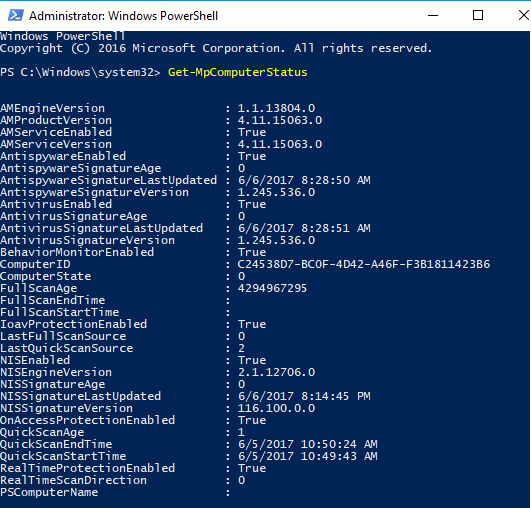 ZDROJ : Vice o get-mpcomputerstatus na stránce Microsoft https://technet.microsoft.com/en-us/itpro/powershe ll/windows/defender/get-mpcomputerstatus