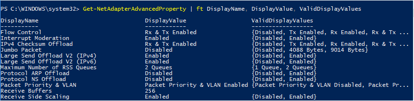 Get-NetAdapterAdvancedProperty | ft DisplayName, DisplayValue, ValidDisplayValues