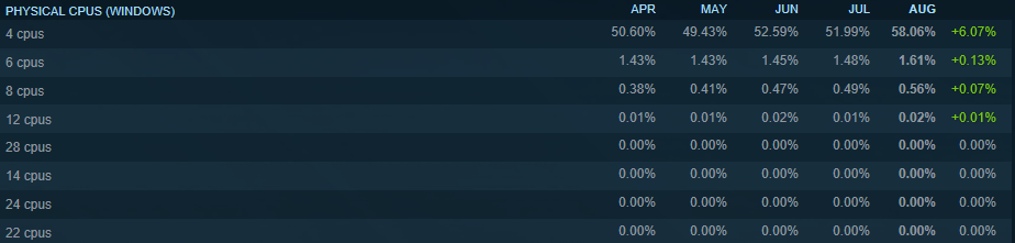 * Navic 4C|xxT je opravdu v cele poctu uzivatelu (58.06%), vyvojari pro par procent CPU (zdroj STEAM) které jsou 6@Core (1.61% uzivatelu) nebo 8@Core (které nedela ani 1% uzivatelu) v celkovém pomeru AMD vs Intel : Intel 82.28% AMD 17.72% velké optimizace delat nebudou.