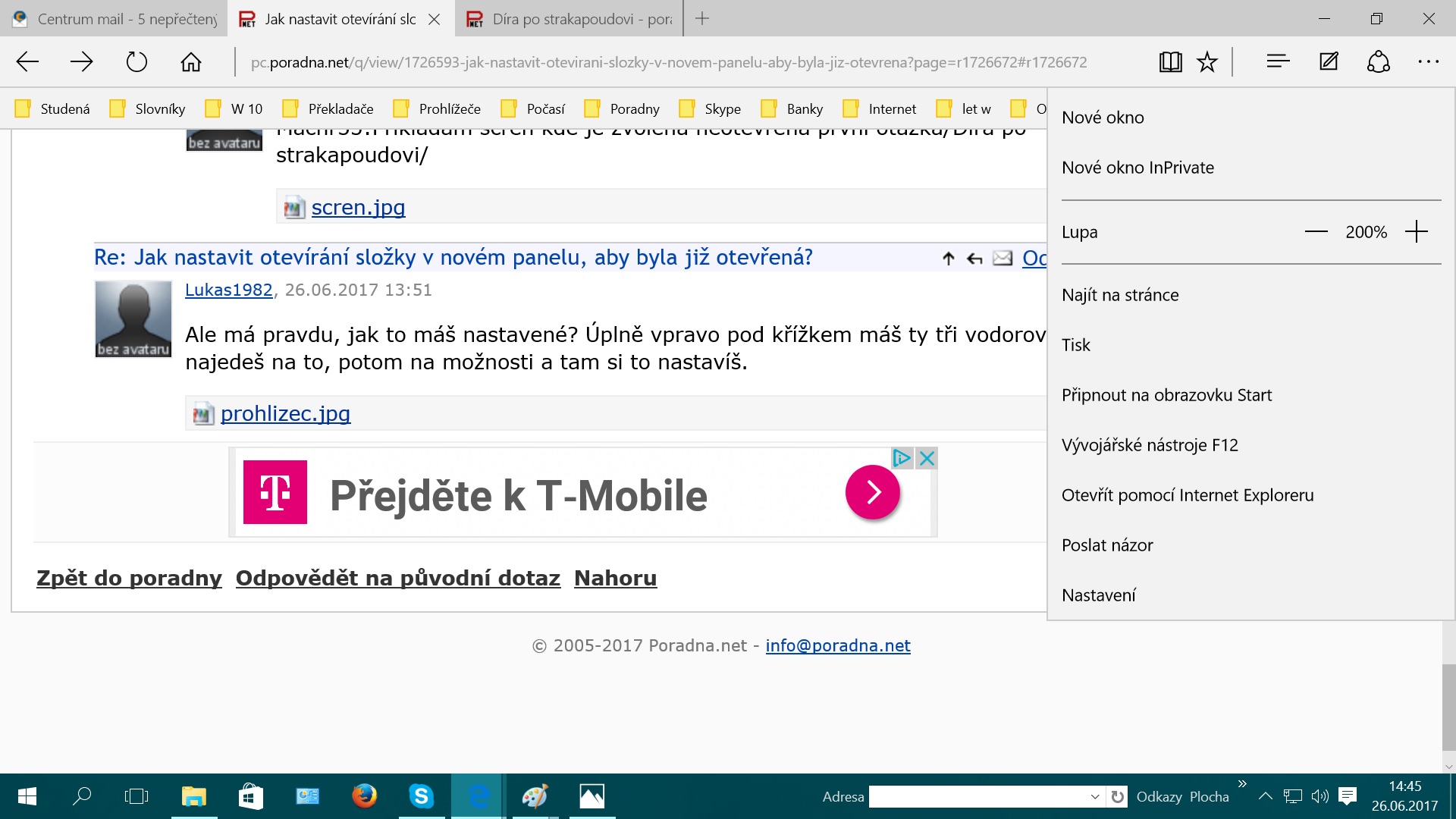 Lukáš:V návodu žádne možnosti nejsou(viz příloha) pouze kolonka nastavení a tam žádná možnost není otevírat nová okna v panelech jak máš Ty v příloze.Takto to fungovalo, když jsem měl OS XP v prohlížeči Firefoxu.Nyní mám W10 a to je úplně o něčem jiném.