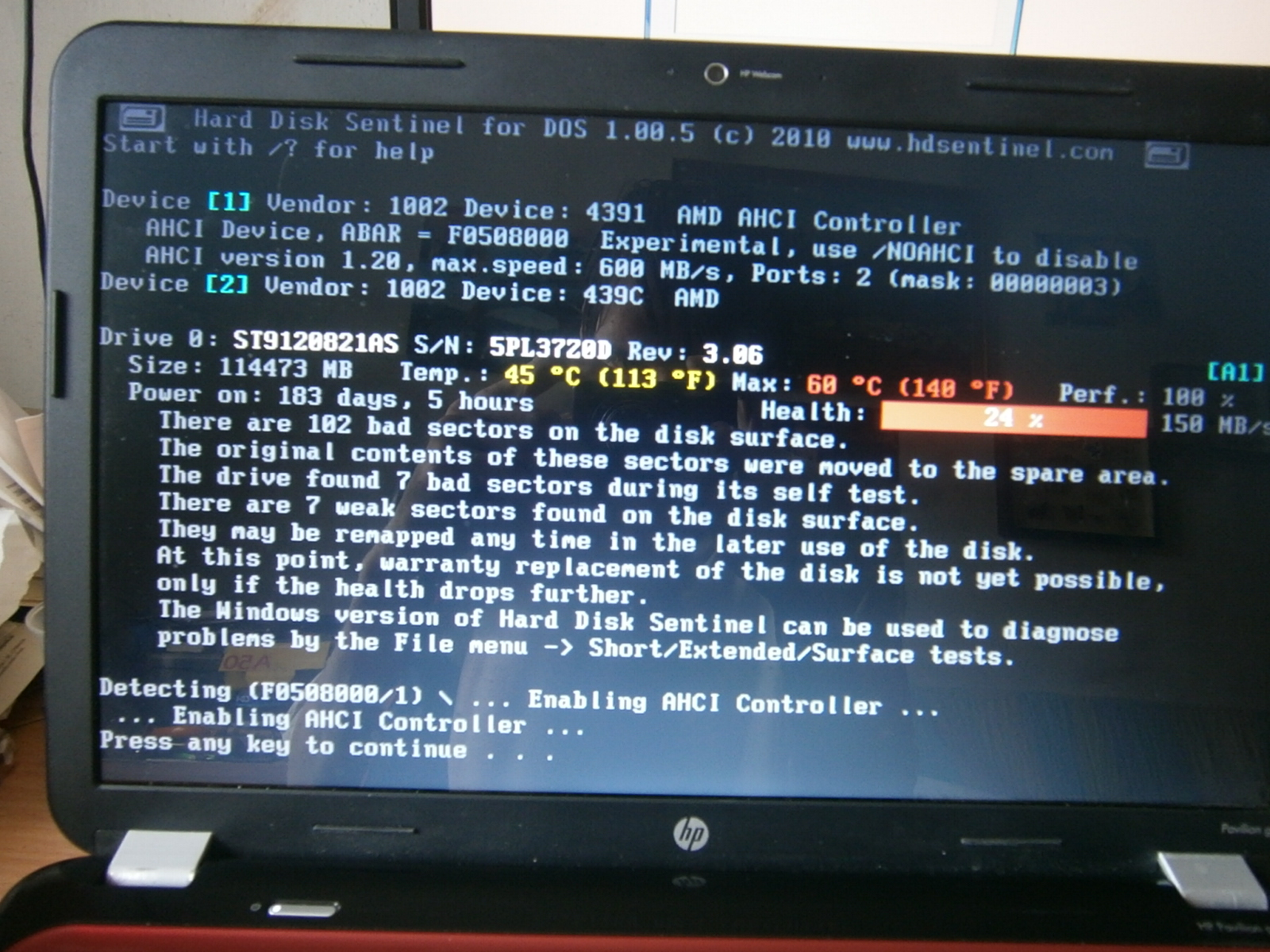 Disk byl vystaven teplotě 60°C, i ta současná 45°C je dost vysoká, tak se nediv, že se ti tam vadné sektory líhnou jako houby po dešti.
