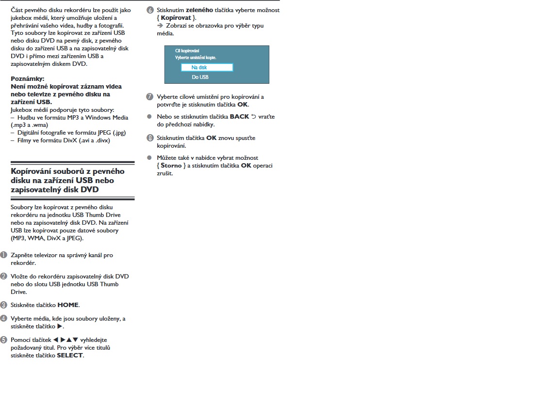 Napíšu to obráceně - na USB nelze kopírovat záznam videa nebo televizního pořadu. Je to napsáno o pár řádek výš i na tom obrázku, který jsi postnul. Proto je lepší nahrávat přímo na DVD. Vyhneš se tak kopírování z disku. Je sice bezztrátové, ale zabere čas. V počítači pak normálně video z DVD zpracuješ některým z video editorů. Ty si v drtivé většině poradí i s formátem souborů na disku (*.vob) nebo můžeš záznam z DVD převést na mpeg. Já jak jsem již psal používám Mpeg Video Vizard - je to stařičký SW, ale pracuje spolehlivě. Výhoda převedení na mpeg (ony tedy i voby jsou mpeg, takže by stčilo je i jen přejmenovat) je ta, že pět vobů (při plném disku) se převede na jeden mpeg.