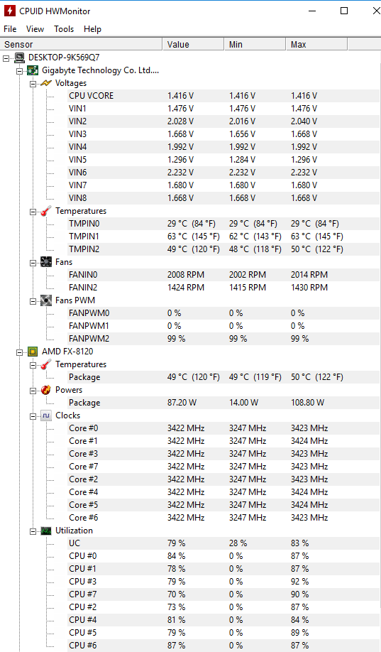 Došel jsem z města a žádná hra nejede víc než 10-15 fps. Zkoušel jsem kompletní scan PC, jestli není malware/virus a nic se nenašlo. Dále jsem si myslel, že by mohly odejít nějaké větráčky v PC, tak jsem kompletně otevřel PC a šel od větráčku k větráčku a vše foukalo jak má. Stáhl jsem si i program HW Monitor, abych zjistil teploty (screenshoty v příloze).
