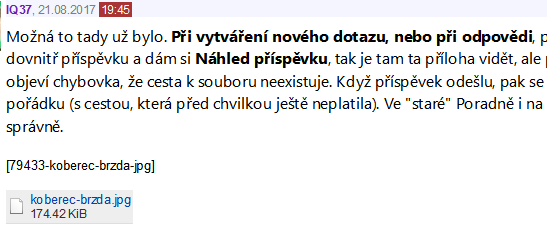 Nejde zalomit (nezalamuje se) text v podpisu příspěvku. Viz. příloha. Stejně se to projevuje i v nastavení uživatelského profilu (po změně v kartě Nastavení). Dále: Pokud si otevřu boční panel, tak ten "editační" text (Upravit, Smazat, Odpovědět ap.) uteče úplně mimo obrazovku a musím zavírat boční panel (viz druhá příloha). Dále: Možnost vložení přílohy je příliš "nenápadná". Dále: V "citacích" orámovat celý text citace, alespoň tenkou čárou dookola nebo jemně podbarvit - není to moc vidět, že je to citace. Dále: Ta rozevírací šipečka (volba kategorie Poradny nahoře v hlavičce stránky) je naprosto utajená (vím, že lze listovat až dolů do patky stránky). Tam snad někdo klikne jenom náhodou. Nahradit to šipkou s textem Kategorie či podobně?