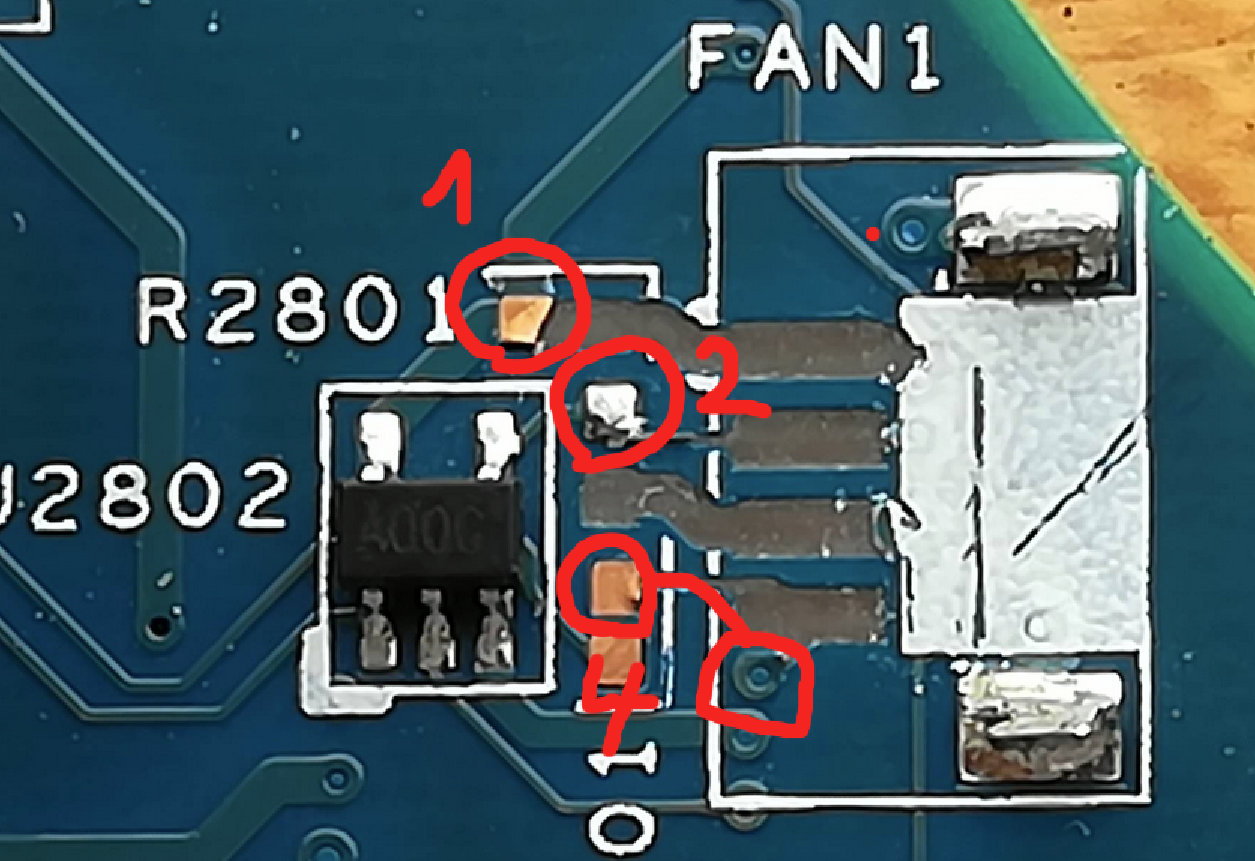Konektor utržený z desky nejprve odpojíš od kabelu+konektoru ventilátoru (doporučuju držet v pinzetě), opatříš kablíkama - připájíš zespod/zboku, a následně připájíš k uzlům a samotný konektor k bočním úchytům (pokud jsou zcela zničené, doporučuju přilepit např. pomocí tavného lepidla).